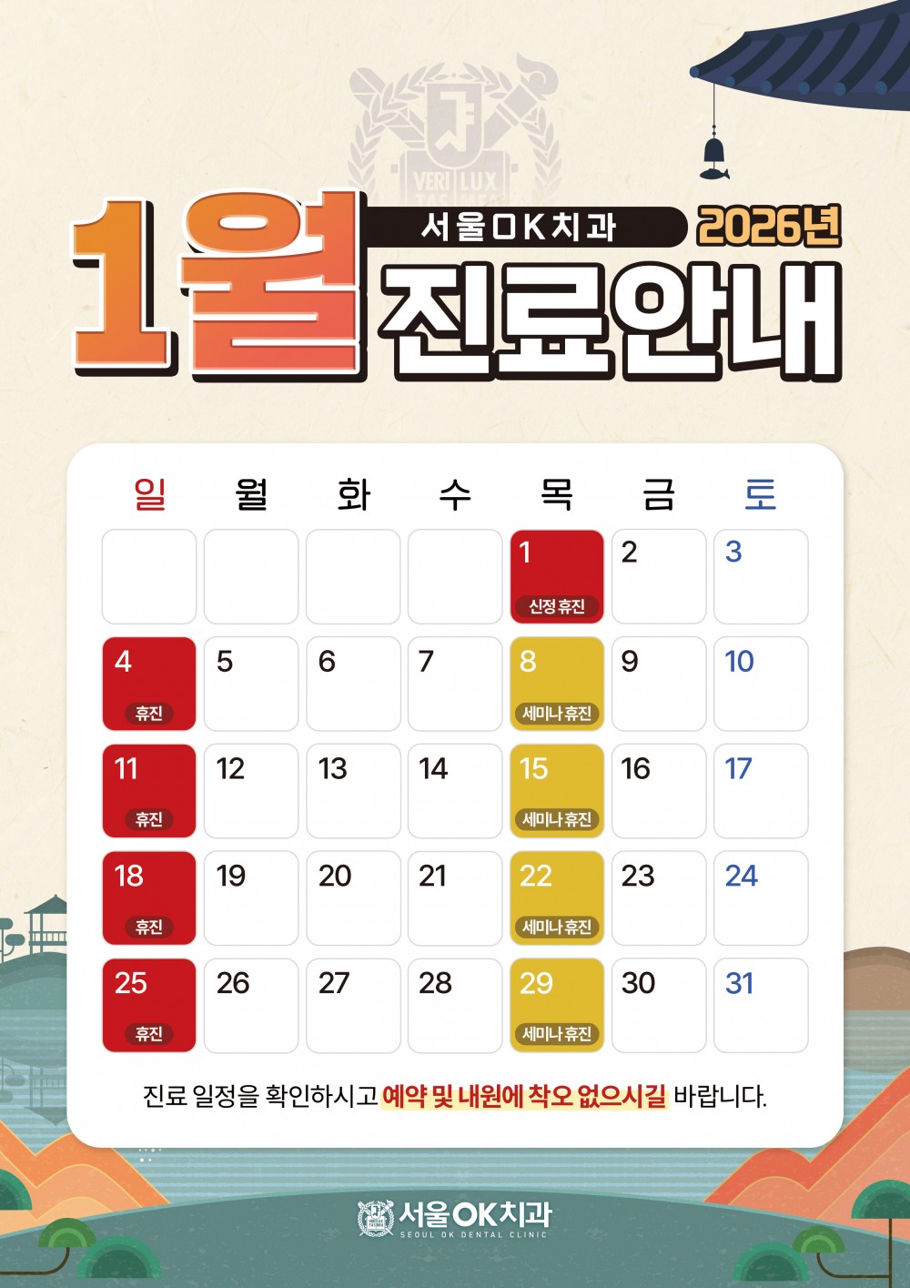 서울OK치과 1월 진료일정 안내 페이지 정보 작성자 서울OK치과의원 관련링크 본문 안녕하세요 :) 서울OK치과 1월 진료일정 안내드립니다. 진료일정을 참고하시어 예약 및 내원에 불편함 없으시길 바랍니다.