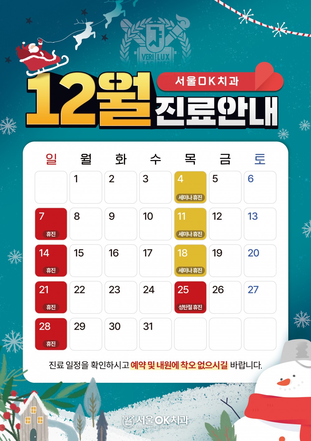 서울OK치과 12월 진료일정 안내 페이지 정보 작성자 서울OK치과의원 관련링크 본문 안녕하세요 :) 서울OK치과 12월 진료일정 안내드립니다. 진료일정을 참고하시어 예약 및 내원에 불편함 없으시길 바랍니다.
